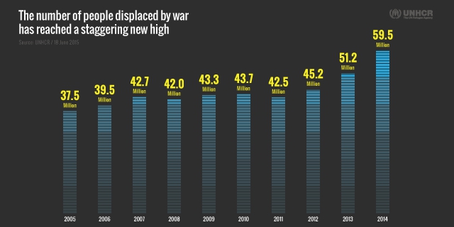 Earlier this year the UNHCR released one of their Global Trends Report that is a must-read. Wars, conflict and persecution have forced more people than at any other time since records began to flee their homes and seek refuge and safety elsewhere. The report said the number of people forcibly displaced at the end of 2014 had risen to a staggering 59.5 million compared to 51.2 million a year earlier and 37.5 million a decade ago.